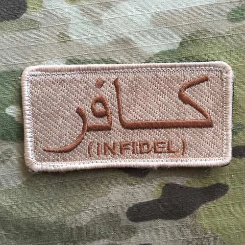 Nášivka "Infidel - Nevěřící" ,s překladem do arabského jazyky, velikost 90x45 mm, barva DCU, připevnění pomocí suchého zipu
