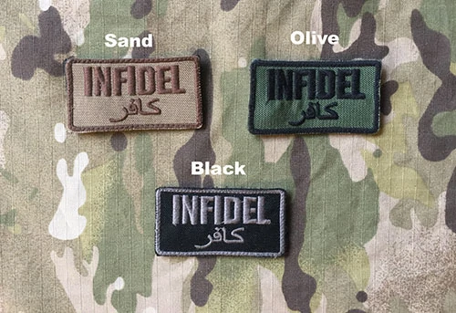 Vyšívaná nášivka "INFIDEL" , připevnění pomocí suchého zipu, velikost 70x40 mm
