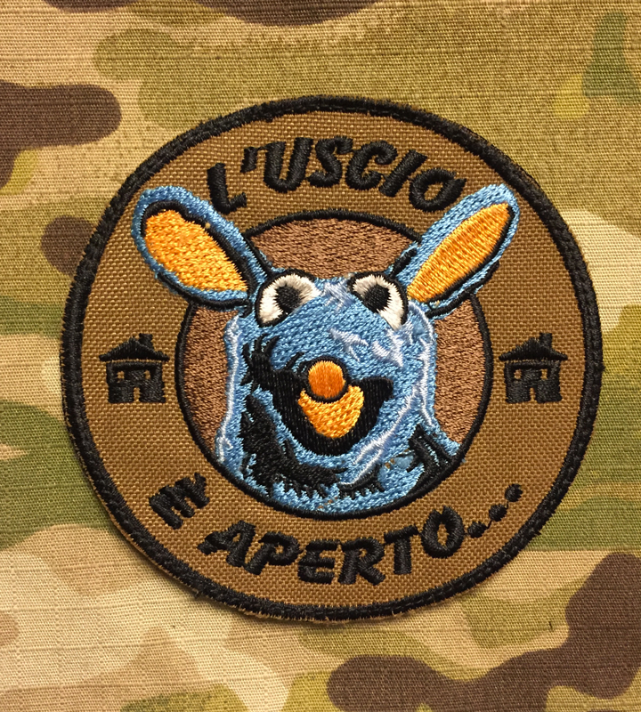 Vyšívaná nášivka "L'uscio é Aperto" , připevnění pomocí suchého zipu, velikost 85x85 mm