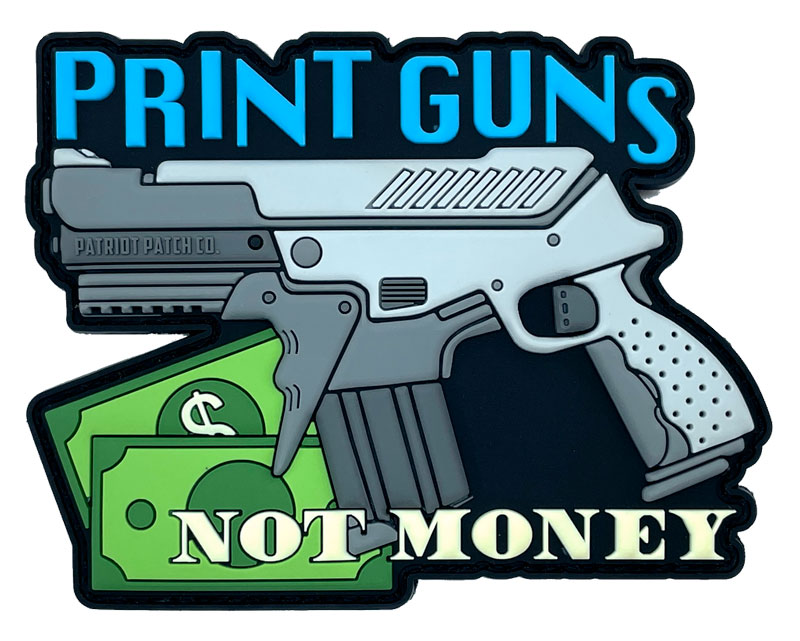 3D PVC nášivka "Print Guns Not Money", velikost 100x75 mm, připevnění pomocí suchého zipu