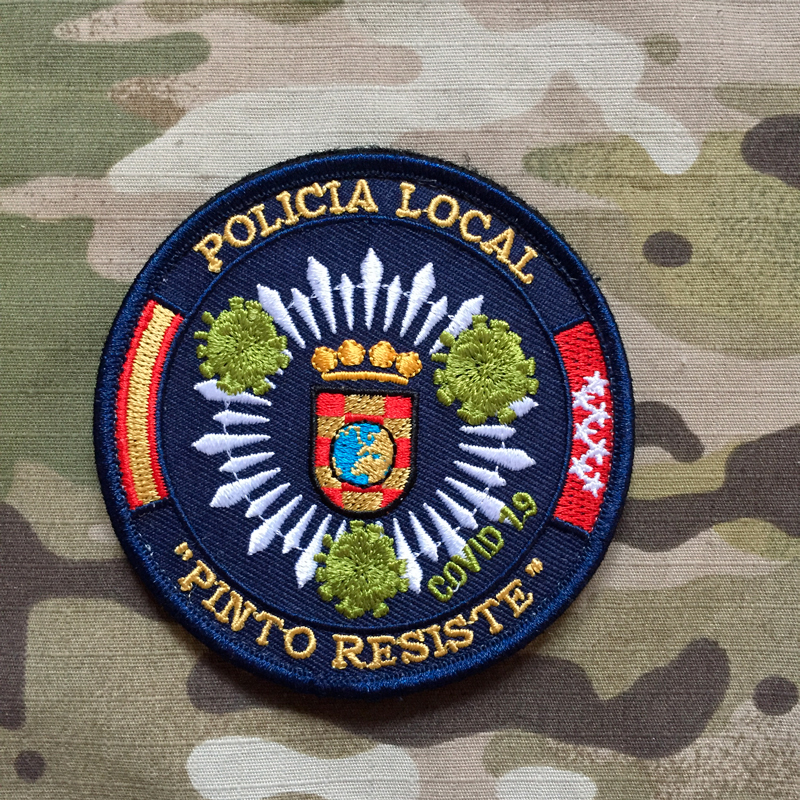 Vyšívaná nášivka "Spain Policia Lokal Pinto Resiste COVID-19", rozměry 85x85 mm, připevnění pomocí suchého zipu