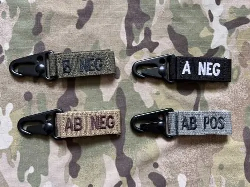 Identifikační přívěšek s krevní skupinou AB Neg, možnost pověšení na taktickou vestu, uniformu , taktický popruh zbraně, atd., rozměry 110x25 mm