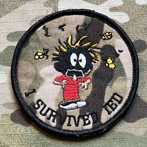 Vyšívaná nášivka "I Survived IED", připevnění na suchý zip, rozměry 85x85 mm,