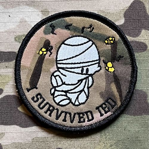 Vyšívaná nášivka "I Survived IED", připevnění na suchý zip, rozměry 85x85 mm,